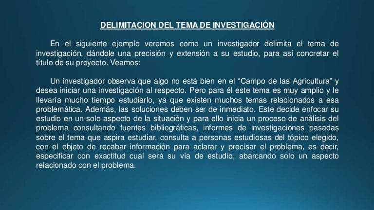 Delimitacion del tema de investigación en el siguiente ejemplo veremos como un investigador delimita el tema de investigación, dándole una precisión y extensión a su estudio, para así concretar el título de su proyecto. Delimitar un tema de estudio significa, enfocar en términos concretos nuestra área de interés, especificar sus alcances, determinar sus límites.