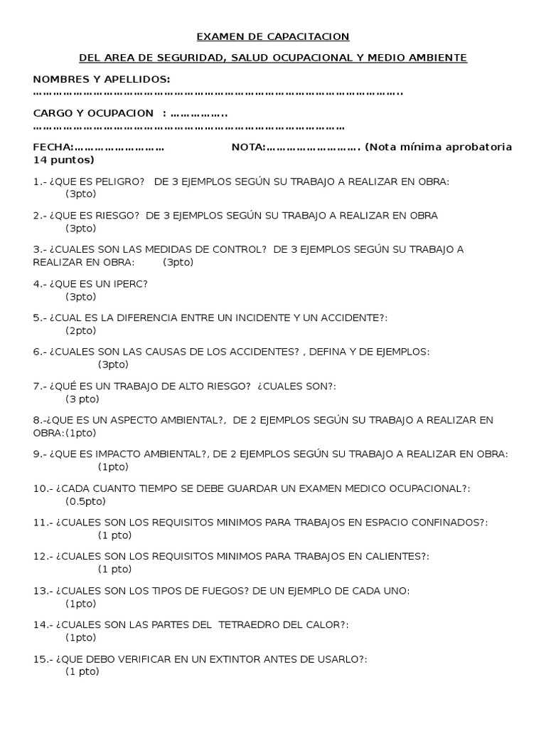 Descargue como docx, pdf, txt o lea en línea desde scribd. Medidas de seguridad y salud laboral. Guardar guardar examen capacitacion del personal para más tarde.