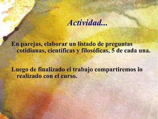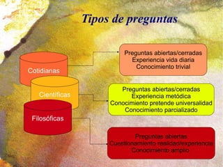 Cual es tu opinión acerca de esto? · ¿por qué los programas que me gusta ver me parecen tan cortos y los que odio parecen tan. Tipos de preguntas cotidianas científicas filosóficas preguntas abiertas/cerradas experiencia vida diaria conocimiento trivial preguntas abiertas/cerradas experiencia metódica conocimiento pretende universalidad conocimiento parcializado preguntas abiertas cuestionamiento realidad/experiencia conocimiento amplio.