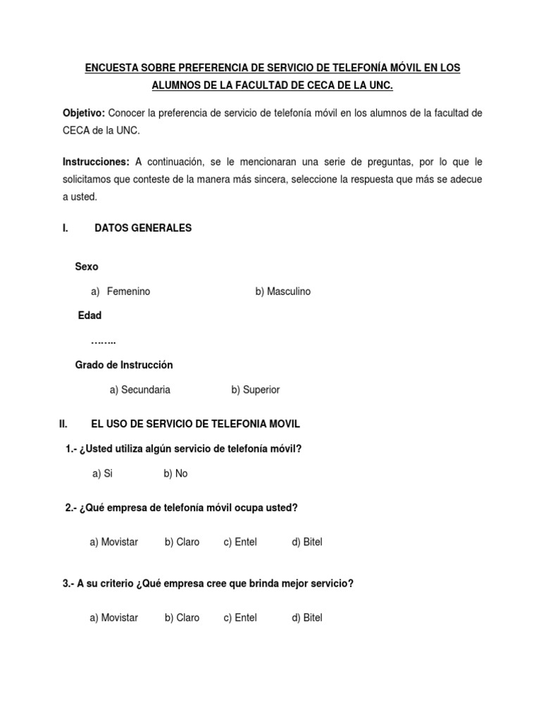 Participa en esta encuesta contando si estás conforme o no con tu proveedor actual de telefonía móvil en argentina. Stephani zulyn vilca luque • 20 de junio de 2017 • documentos de investigación • 659 palabras (3 páginas) • 42 visitas. Aun no estando del todo conforme, los clientes optan por no cambiar de empresa.