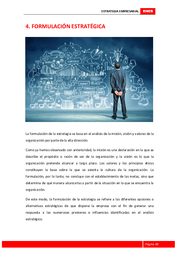 La identificación y la formulación de estrategias son consecuencia de la creatividad de las personas de la organización en relación con el análisis estratégico efectuado. La formulación de estrategias es vital para el bienestar de una empresa u organización. Citas u a empresa no se define por su nombre, sus estatutos o su acta constitutiva, sino por su misión.